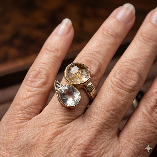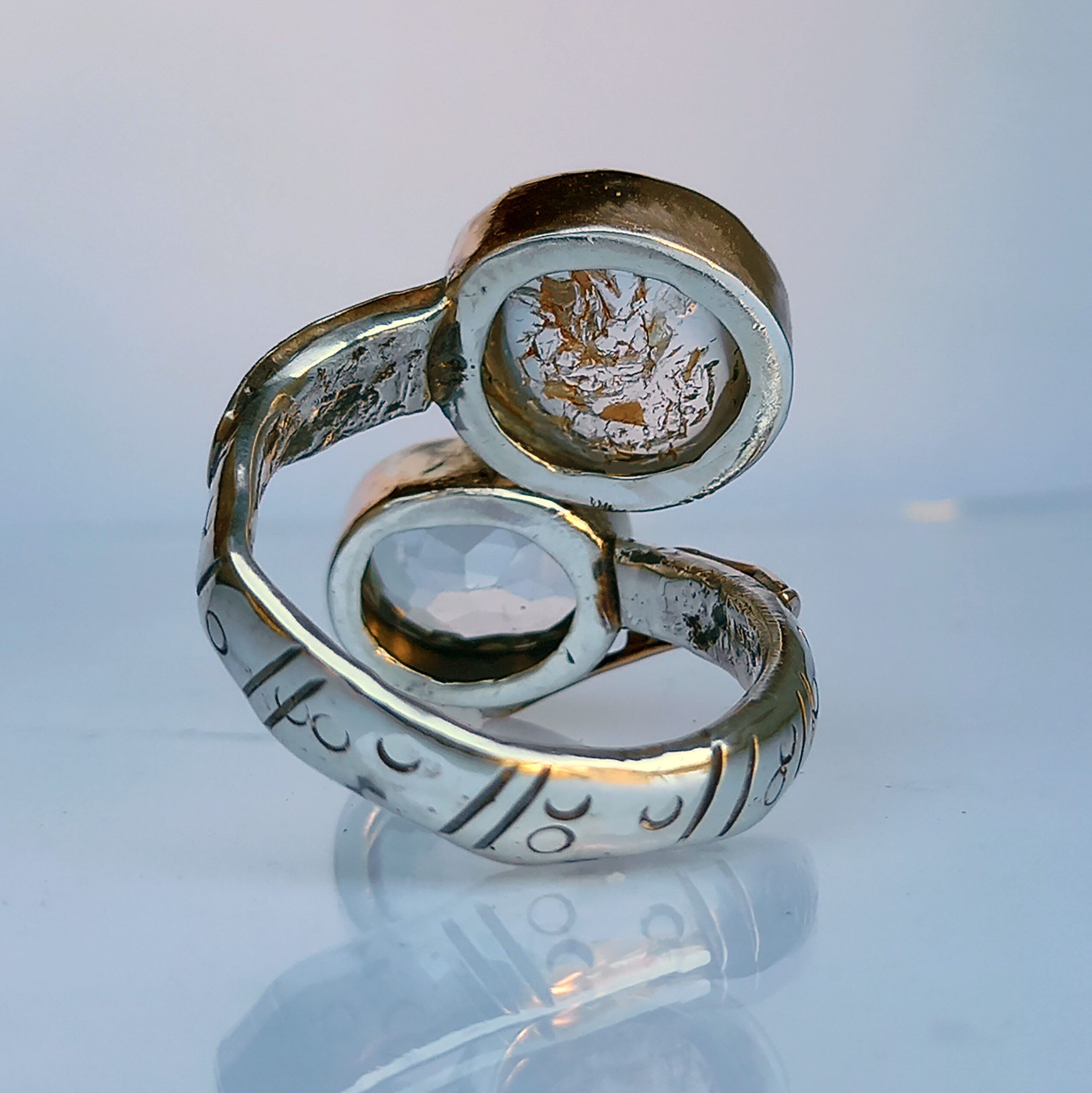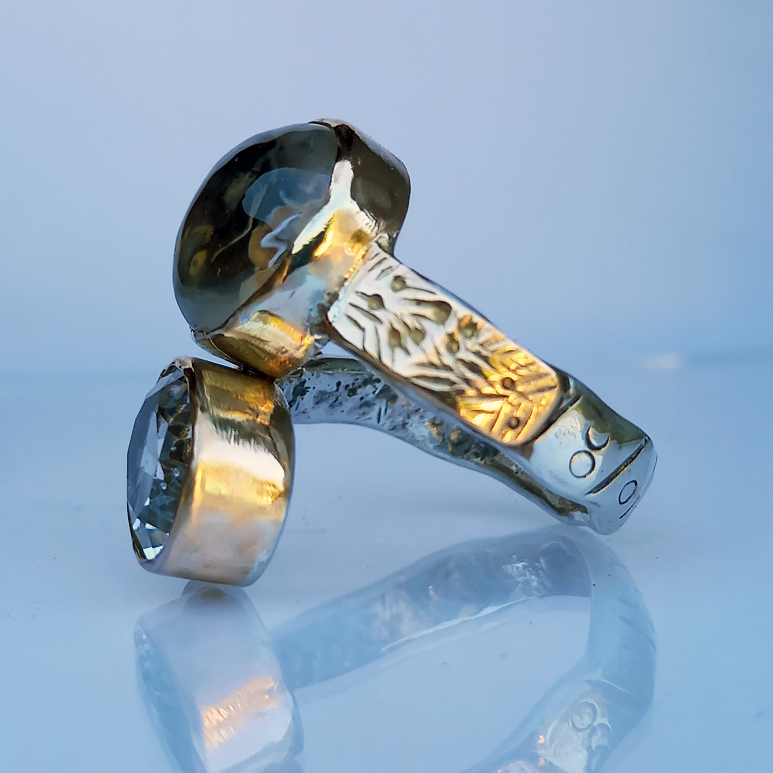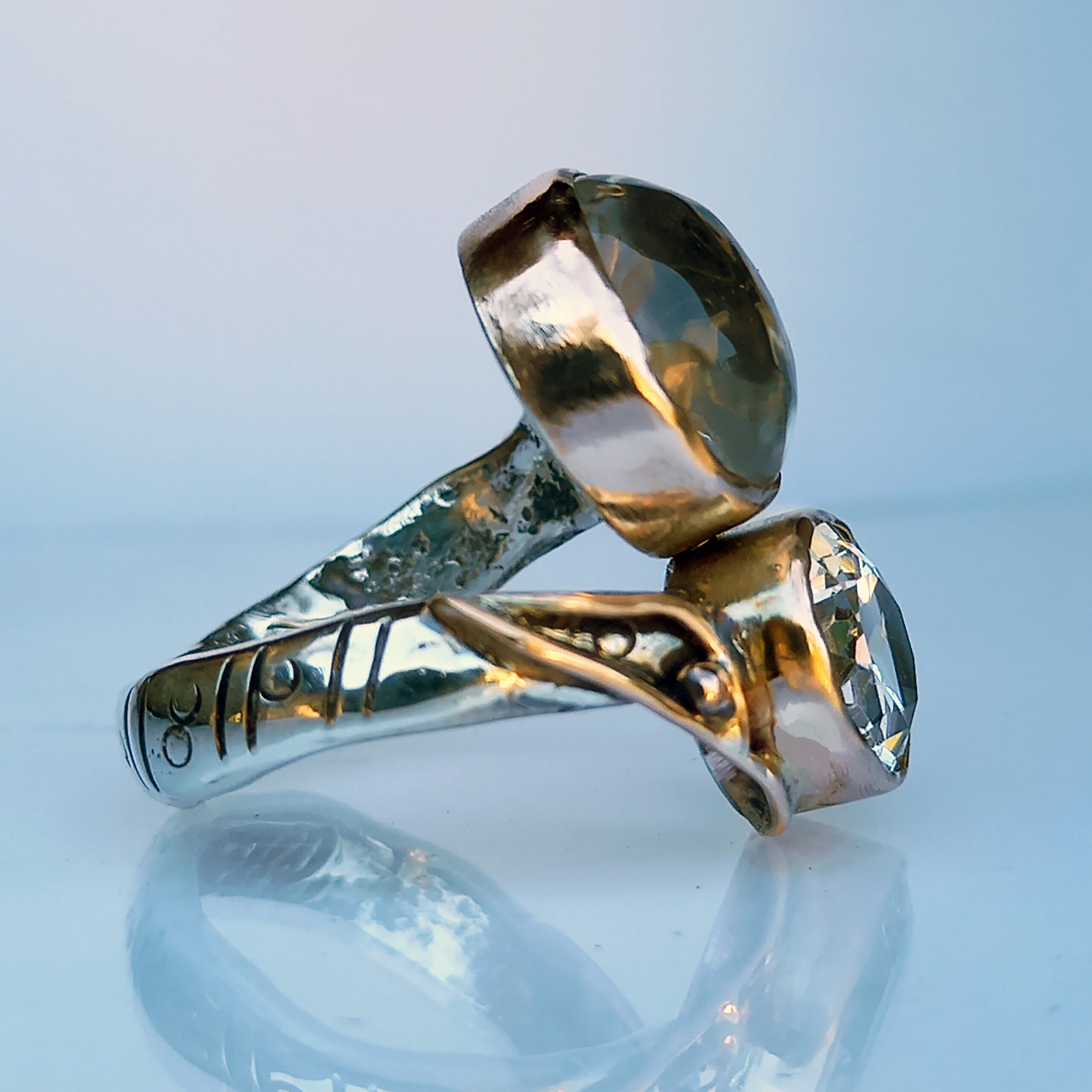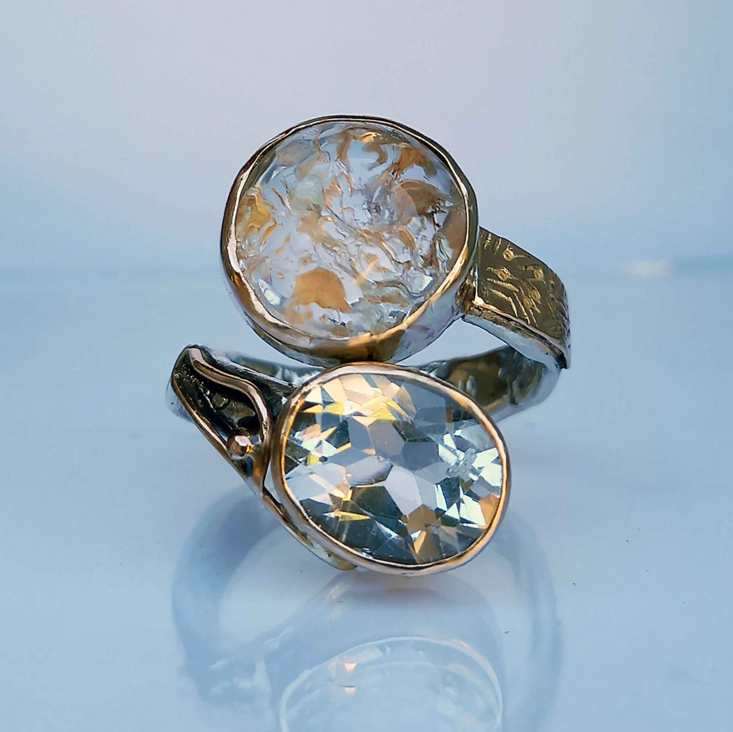 L’anello presenta una struttura in argento massiccio impreziosita da dettagli e profili in oro rosa 9ct che scaldano la composizione e creano un raffinato gioco di luci bicolore,le pietre sono un cristallo di rocca sfaccettato ed un quarzo gold cabochon.